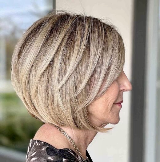 This sleek, chin-length bob with soft curtain bangs is a modern classic that exudes elegance. Light blonde hair enhances mature faces with a vibrant freshness that gives older people a youthful look. People with fine hair can effortlessly achieve a sophisticated look with this attractive hairstyle. The curtain bangs delicately frame the face and suit women with oval or round face shapes as well as those who wear glasses. It’s a graceful yet low-maintenance style that transitions well from day to night for fashionable women over 50.