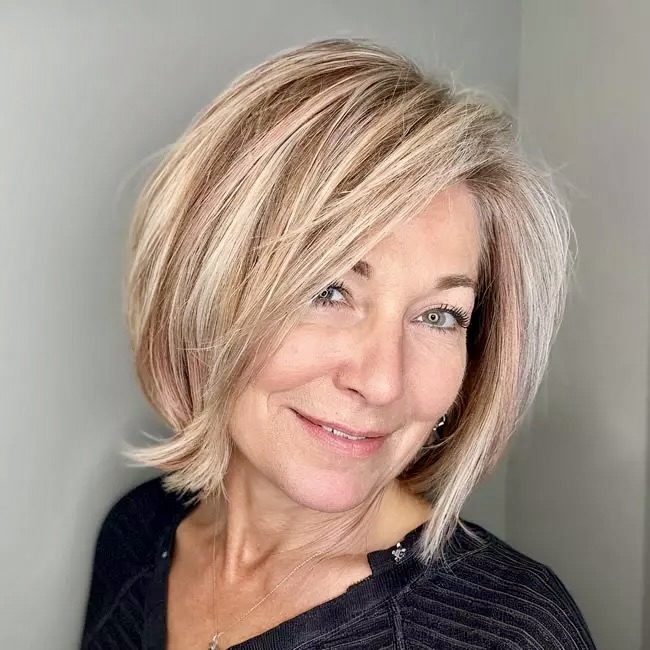 This soft, layered bob brings instant freshness and elegance to women over 50. Fine hair types are perfectly complemented by this light hairstyle with rose gold undertones, as it adds movement and depth while remaining elegant and natural. The low-maintenance shape offers great versatility as it works for everyday and professional looks, while looking great on round faces. For those looking to embrace 2025 style trends with a classic twist, this is one of the best choices for a graceful yet modern look.