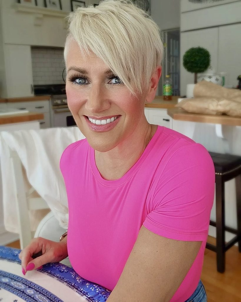 This edgy, asymmetrical pixie is a bold statement for confident women over 50. A combination of platinum color and a side-swept fringe creates a stylish contrast that enhances the overall facial structure, especially for those with either fine hair or oval faces. The cut proves to be both easy to maintain and on-trend as it represents the latest haircut predictions for 2025. The layered top creates volume while keeping the back short and manageable-perfect for warmer climates or active lifestyles.