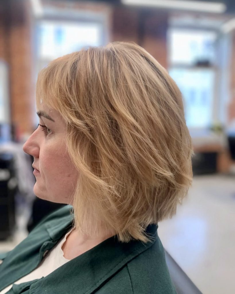 This tousled, layered bob adds volume and movement, making it perfect for fine wavy hair or straight hair that needs extra body. This cut extends below the traditional bob length to reach the jawline, accentuating round faces while adding youthful dynamism to the look. The layered design establishes itself as an effortlessly unkempt style, so all you need is a texturizing spray to complete the look. The honey blonde color brings warmth and brightness, and this look is especially suited for women who want an effortless, low-maintenance cut for 2025.
