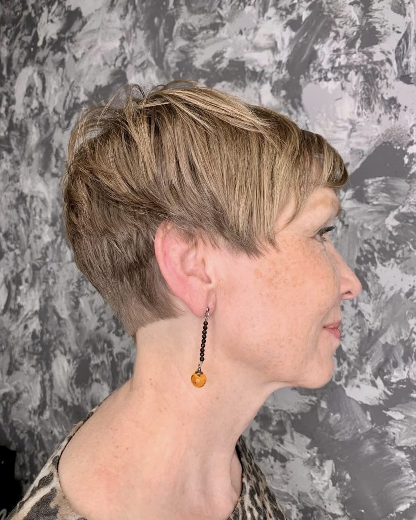 For women looking for something bold and edgy, this tapered pixie cut delivers. The nape area is tightly trimmed before subtle layers are created on both sides and the crown, which works well on delicate hair types and provides excellent results on face shapes including square and oval. The asymmetrical front bangs add softness to the overall balanced aesthetic while maintaining a clean, sophisticated style. This style is suitable for fine-haired individuals over the age of sixty as well as those who want to transform their look with a trendy yet mature look. Pair it with statement earrings to accentuate the neckline and cheekbones.
