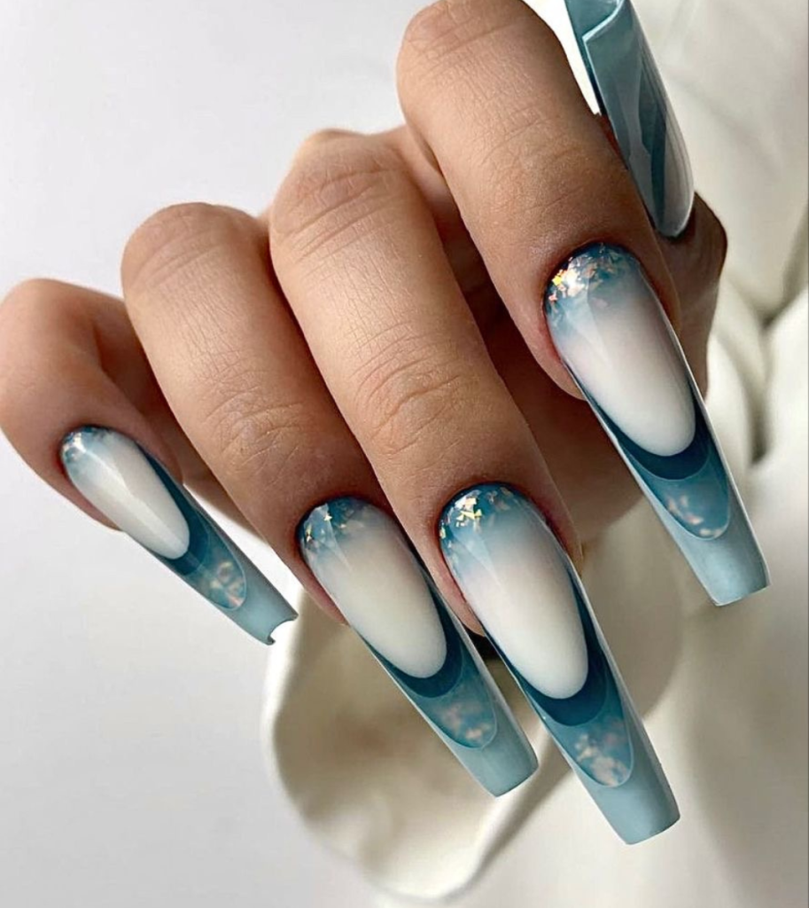 The cool, crisp tones of these nails are reminiscent of a serene winter morning. The transition from a pearly white to a deep sea blue creates a simple yet profound ombré effect. The addition of glitter at the tips evokes the image of freshly fallen snow glittering under the morning sun. This design would complement a minimalist wardrobe, adding a dash of sophistication without overwhelming the senses.