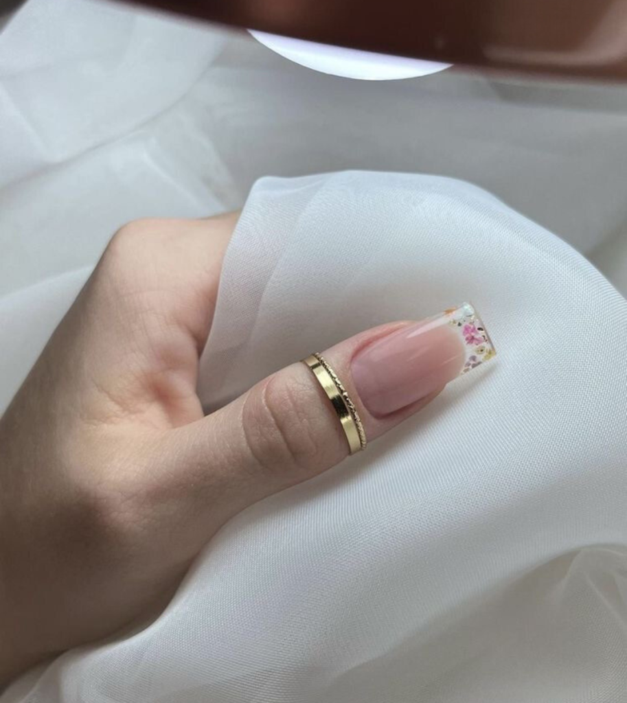 At this point, we can witness the harmonious intertwining of aesthetic beauty and metallic elegance. The middle-length nails are paired with a nude gradient and clear tips embellished with floating rose gold leaf ephemera. This design is a case in point for the global version of the French manicure, which goes well for those who would wear plain but chic styles with a touch of glam.