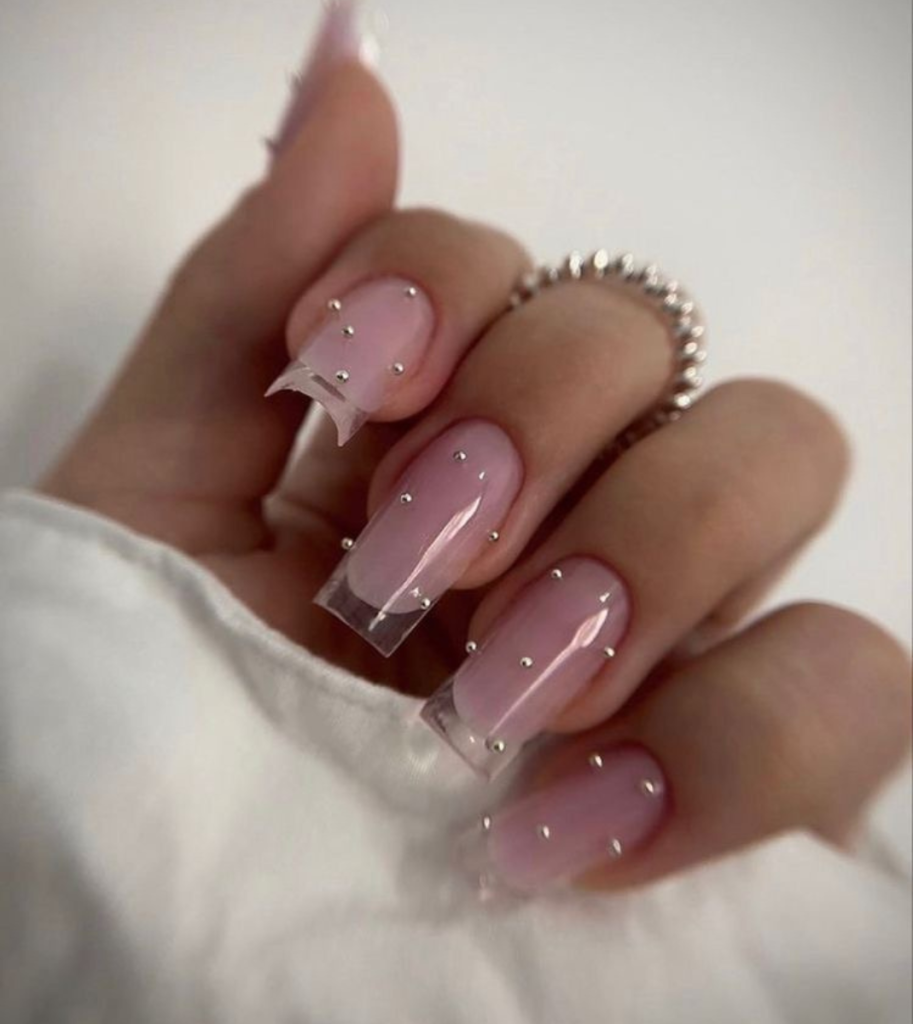 In a calm pink shade, these nails are the purest and most graceful color of nails. A transparent tip embellished with small rhinestones produces a delicate and soft luminosity, which makes it a good choice for those who love a little glamour to their cute and feminine aesthetics. The design can even be worn to a day in the office or to a disco, besides, it goes to almost all khaki outfits because it has chic but not so much visible elegance.
