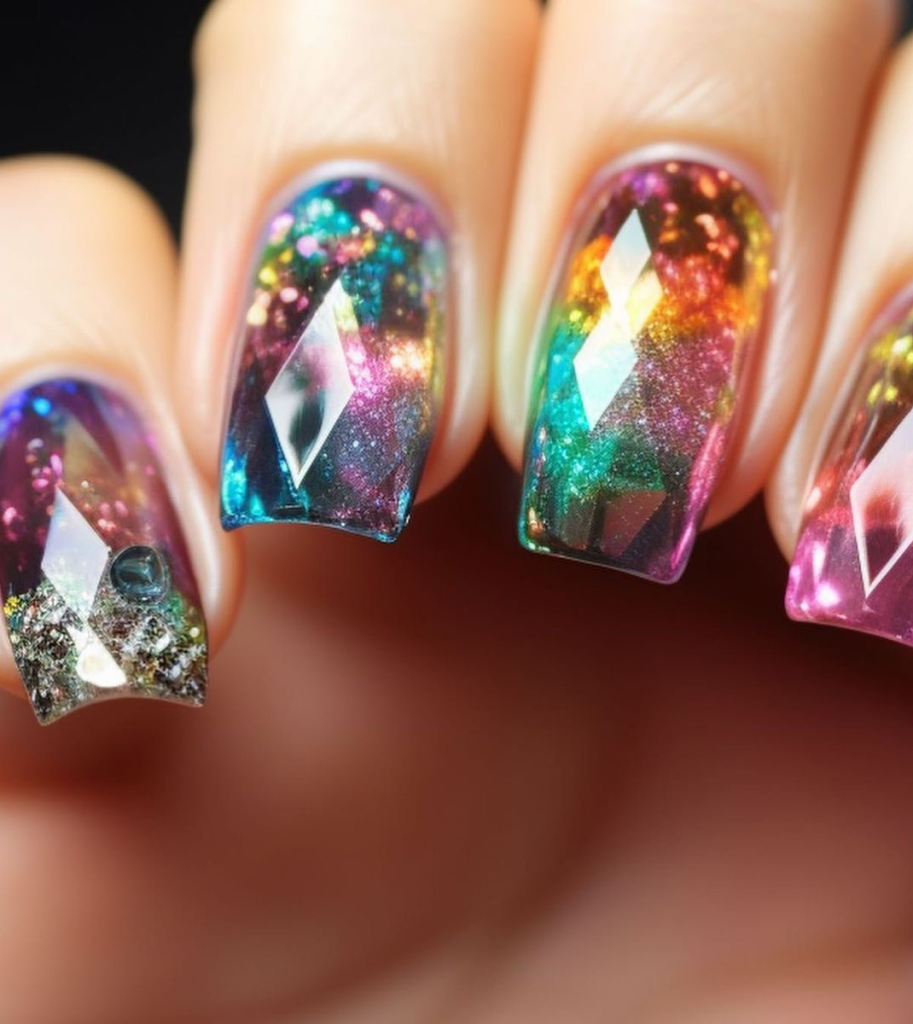 Welcome to a design that perfectly seems to encapsulate the feeling of a multicolor galaxy. These long fingernails are a playground for a cosmic dance of colors, which is further designed with mesmerizing gems that provide an extra dimension and a feeling of opulence. Every fingernail is a piece of the nebula, having flashes of light and bright colors just to make it a catchy, eye-catching look, for the nights when you want to be seen as bright as the stars.