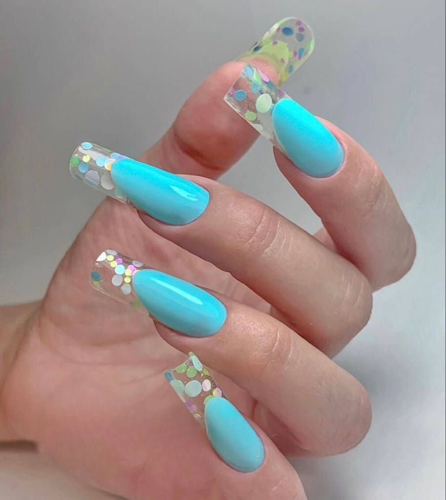 These vivid blue nails are your perfect ticket to the world of underwater beauty. The delightful combination of transparent tips and pastel confetti is the exact representation of sea bubbles floating to the top of a colorful rainbow. This long nail style emphasizes the true expression of colors and the happiness that comes from the addition of a shiny element that doesn’t drown but rather goes well with the bright shade.