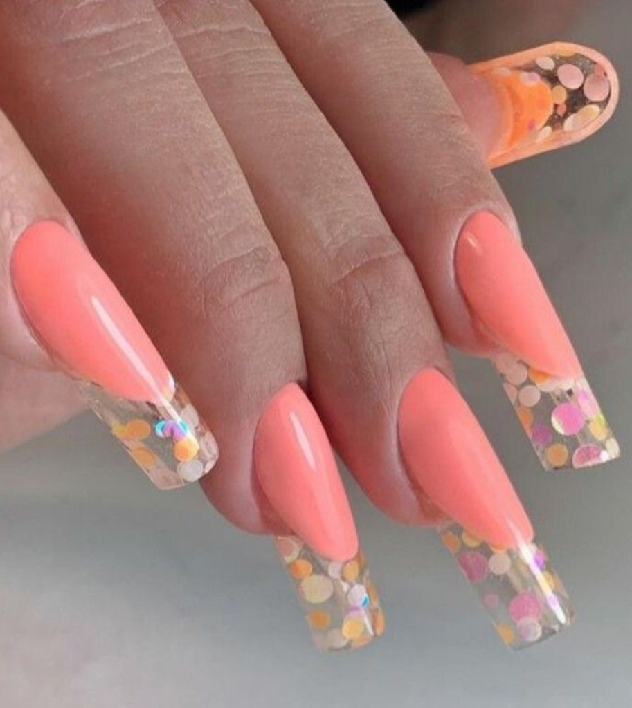 Resembling the soft colors of a dusk, these nails are a mix of delicate orange and a clear tip covered with golden confetti. The glitter gives a spark that is both fun and fashionably chic and results in a design that seems to be both cute and rich of personality. Recommended for use at beach parties or sunset gatherings, their appearance is truly captivating.