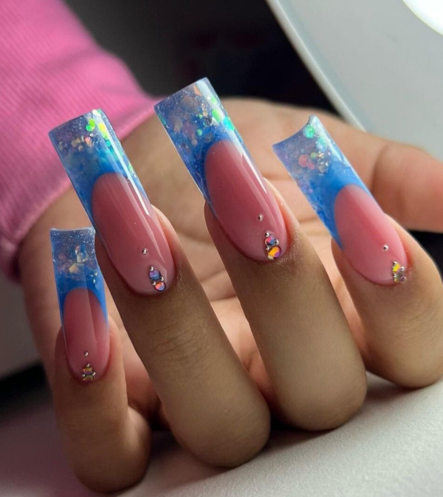 Enter a dreamy nightscape with these long nails that blend a serene pink with a deep blue, reminiscent of the night sky. Accents of rhinestones mimic the twinkling stars, offering a subtle yet mesmerizing sparkle. This design would pair beautifully with evening wear, creating a sophisticated and elegant aura that’s sure to captivate.