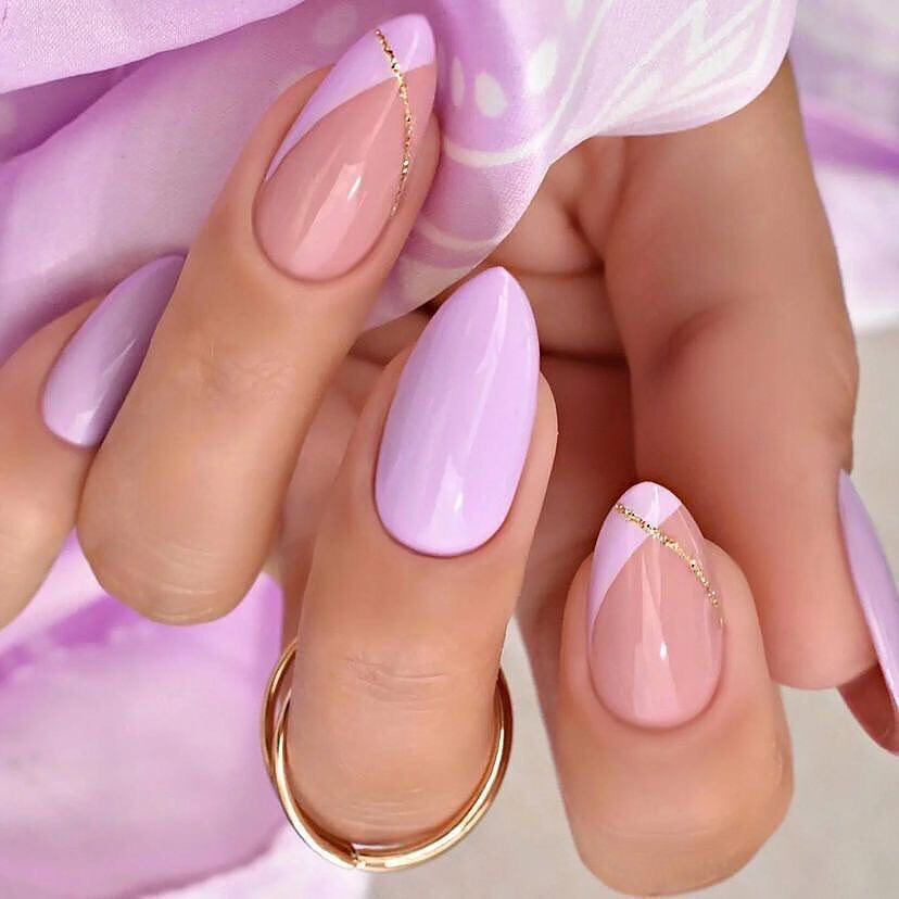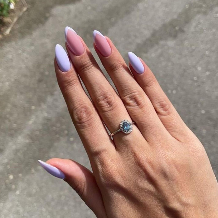 This beautiful duo is elegantly displaying a smooth shift between lavender and pastel pink, which in turn forms a relaxed and smooth ombre.Of course, the almond nails are in their perfect shape, this way to add a bit of elegance. This very design represents the very concept of 2024 trends, which are the summer colors of peace combined with the latest fashion style.