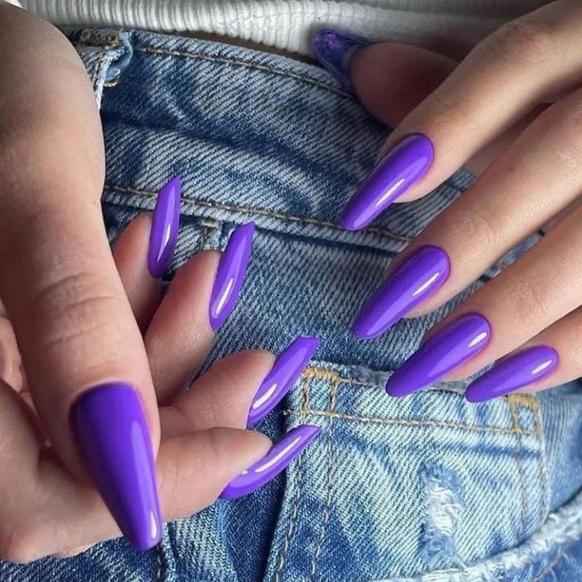 For the brave souls who prefer to flaunt a stronger style, these elongated, coffin-form nails are the embodiment of a free and wild 2024 gel styles. The full of life, vivid purple hue, which is the summer’s highlighter, goes unapologetically without a filter to show you the full of energy sun of the summer. This design is for an extraordinary woman who is not scared to be the center of admiration at a party just because she shows her professional skills in acrylic art.