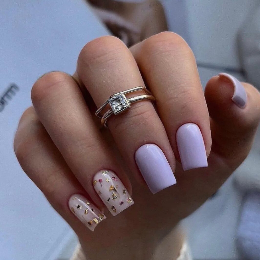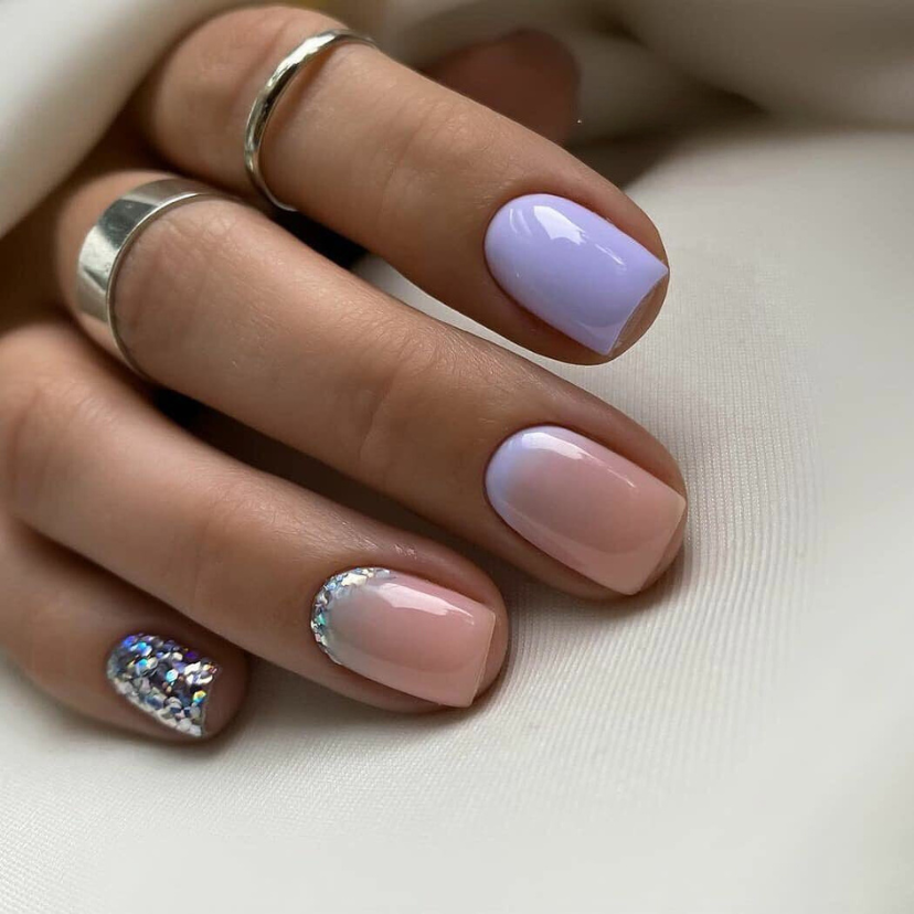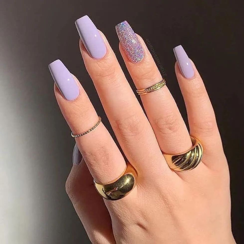 This stunning set captures the sparkle of summer in the best way. Most of the nails are painted with a dreamy lavender color, but one finger on each hand is covered with a galaxy of glitter that shows the starry summer night sky. The design is a combination of 2024 fashion trends and classic styles and can be worn at any time, either for a day or night event.