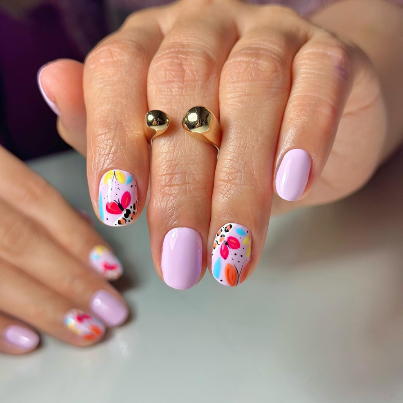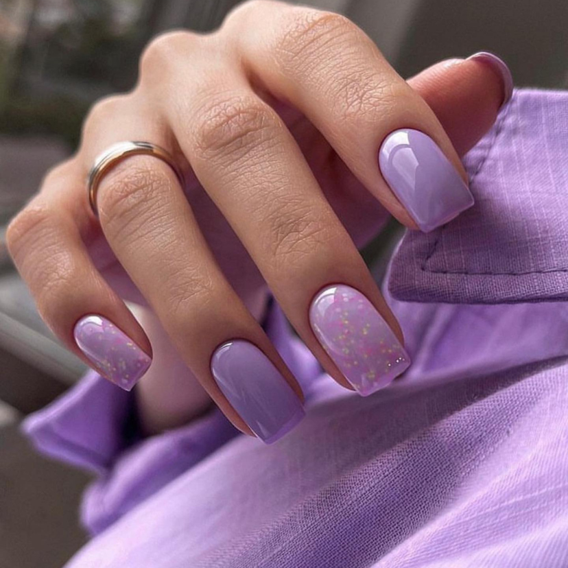 This design is a truly charming combination of cute and pastel. The two nails that are being sprinkled with a confetti of color are adding a subtle and still magical effect to the otherwise smooth lavender base. The speckled nails are a fun way to connect to the 2024 gel and dip techniques that make such creative expressions nail art graf.