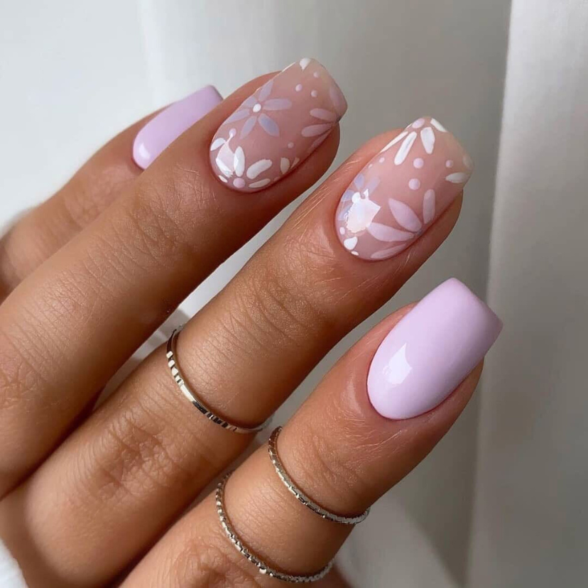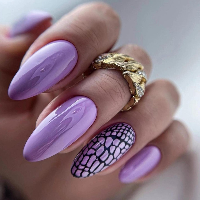 Lavender and a tactile sense are combined here. The single, textured nail which is added to the rest of the solid-color nails imitates the art of lace or fishnet. This style which contrasts the trendy style in 2024 with its boldness of combining different design patterns on a single look, stands for individuality and the daringness to do it.