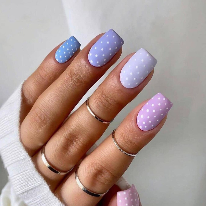A playful combination of dots and purple colors portrays a summer classic with a contemporary twist. The design, which is complemented by the two shades of purple, suggests trends for 2024. The design is for women who love their nails done in a short, round, or square shape but still want to have a touch of playful sophistication.