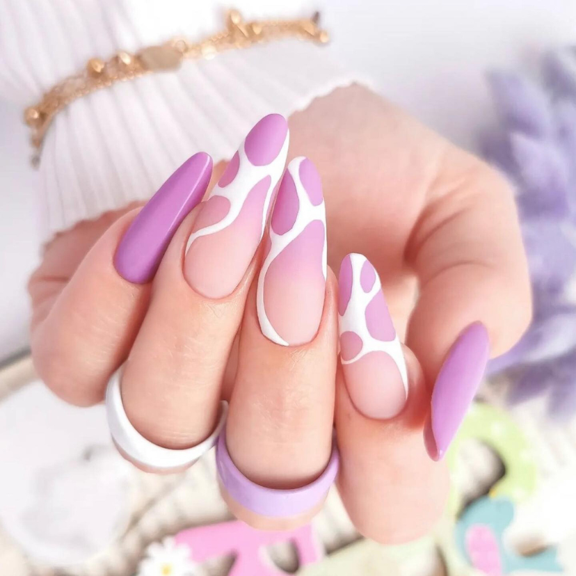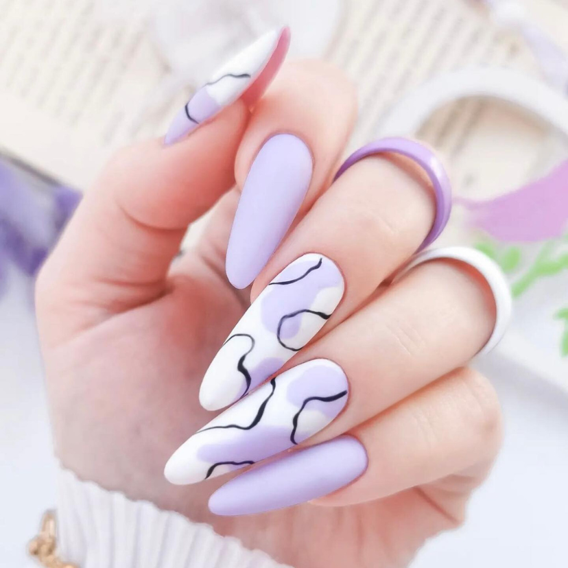 Now, I’ll show you a futuristic vision of the summer purple theme. The nails have a fluid design that imitates organic shapes, like the soft flow of water or the gentle form of clouds. This set combines pastel purple and white, thus forming a pure and lustrous transition that is both pretty and advanced. The new idea on gel nails is an expression of creativity and freshness that corresponds with playful and imaginative style of the summer season.