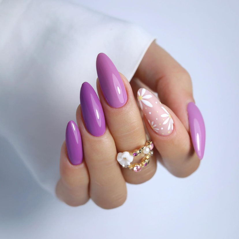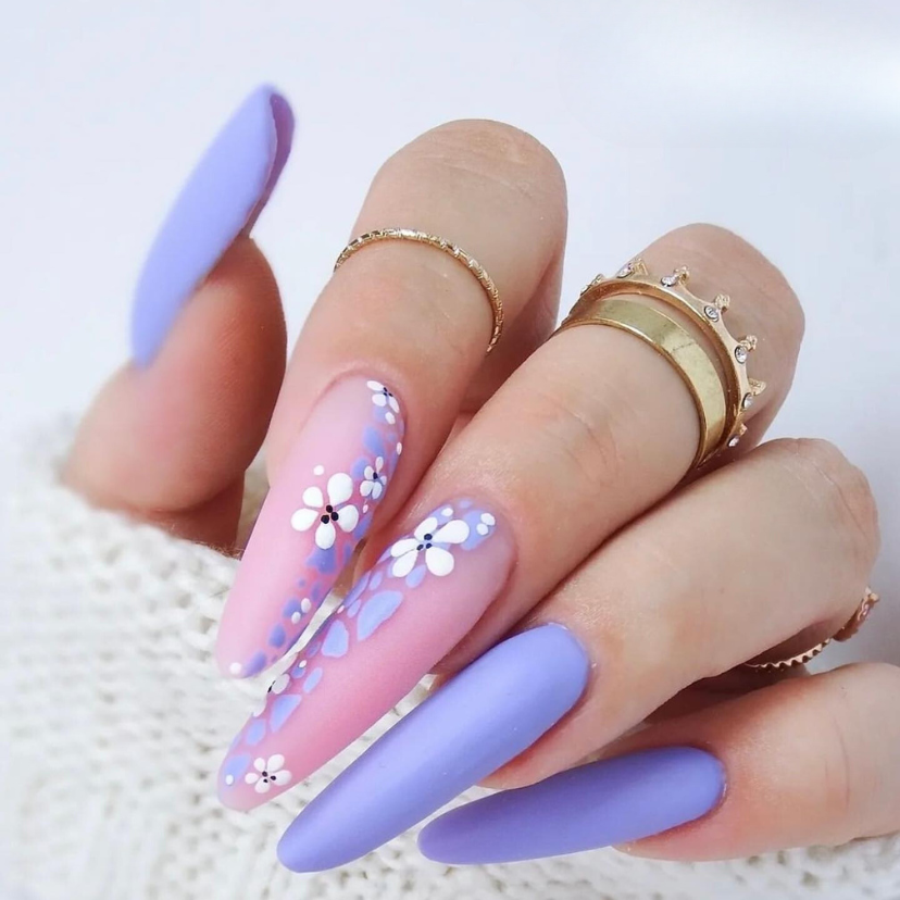 Blooms mysterious and tricky lavender and floristic craftsmanship make this design remarkable. It embodies the 2024 trends of forms that tell the story of both courage and elegance. Almond-shaped nails are actually a straightforward yet brilliant way to achieve a feminine form with your hands, and the accent nail decorated with the soft white blossoms takes the entire image cuter.