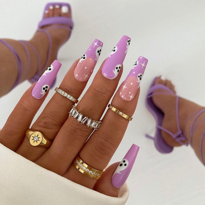 The set is ideal for those lively, and fun-loving women with a jungle spirit. The set exhibits palette purple and ghost patterns. The torch art designs, combined with trendy acrylic nails, create a picture that is cute and contemporary, which is the innovative idea of 2024 gel nails.