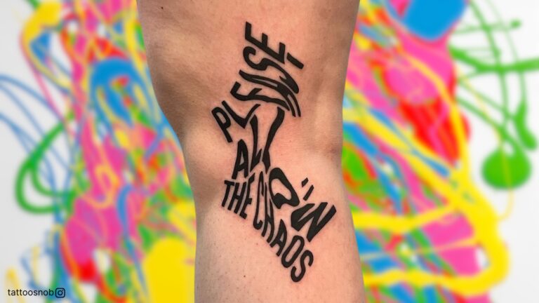The word “chaos” is written in a flowing, elegant script and placed just above the knee—such an elegant piece of ink. It perfectly captures the beauty and complexity of chaos in life.
