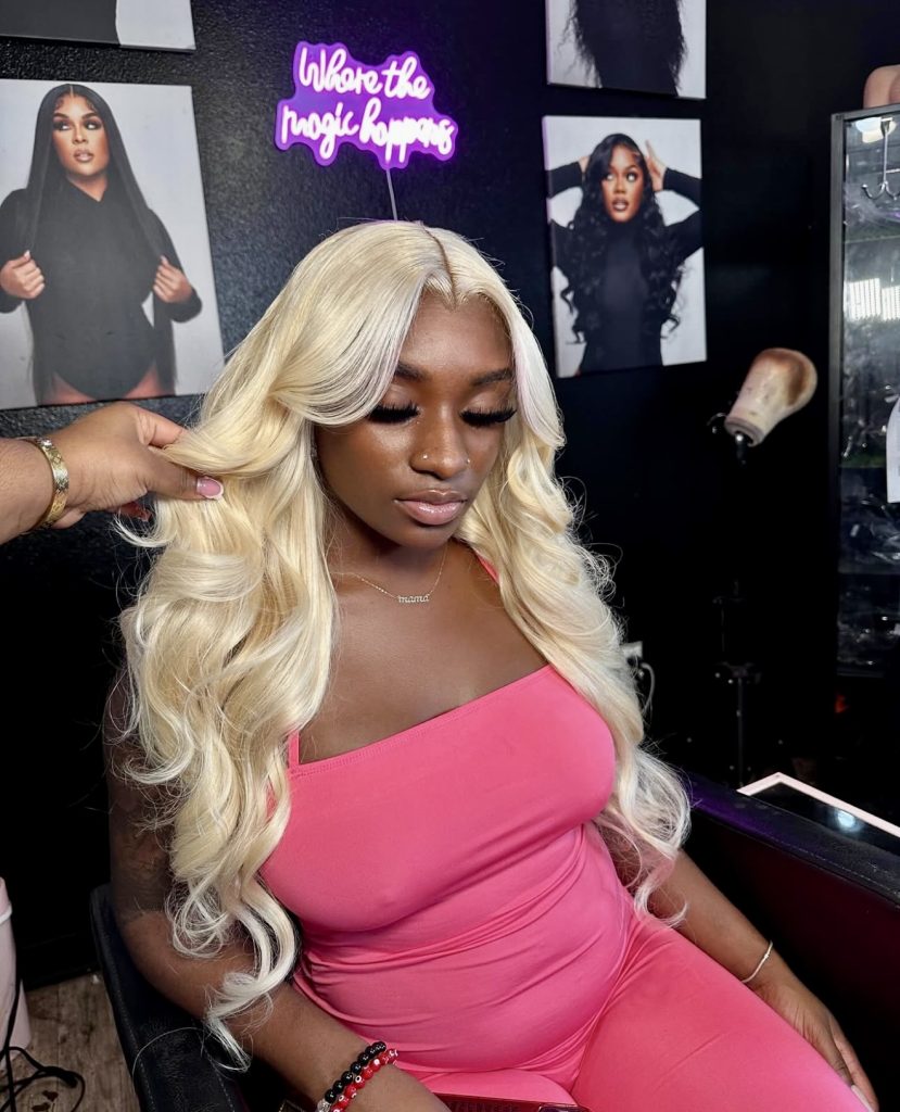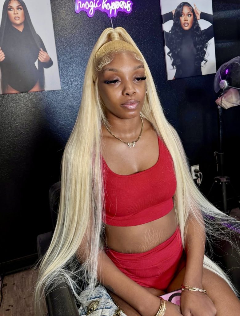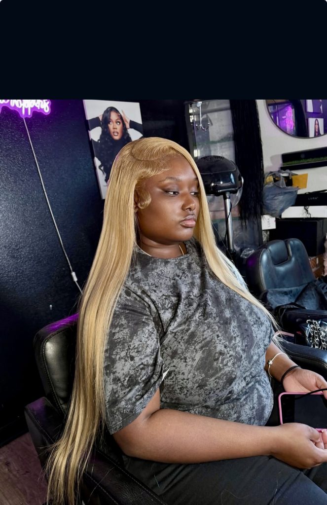 This super sharp platinum blonde is a complete vibe, of opulence, confidence and glam in one super awesome look. The bold color paired with perfectly sculpted latina edges creates that “watch me walk in” energy. It’s not just hair, it’s a full moment.