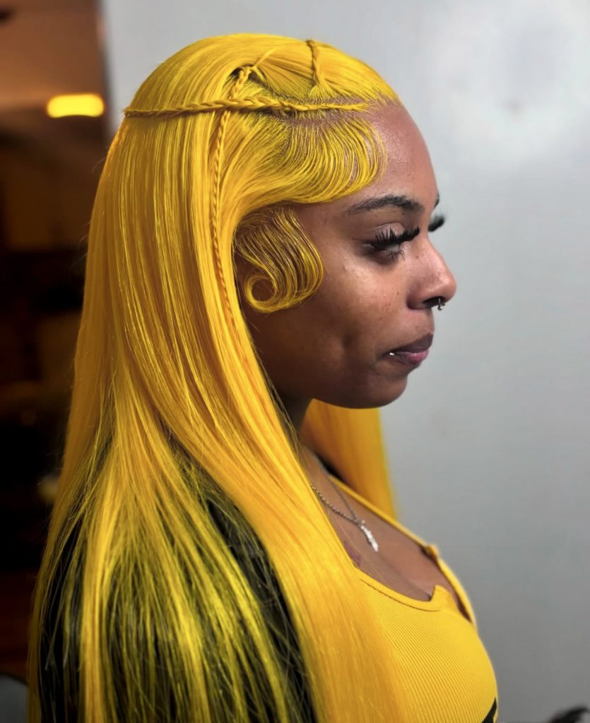 Now THIS is how you make an entrance. The micro braids and swooped baby hairs in neon yellow silk press are brashly loud. It is some juice that is on fire everything still real like lemonade but this is fire, very hard and really sweet and hard to ignore. A true 2000s throwback with a 2025 glow-up.