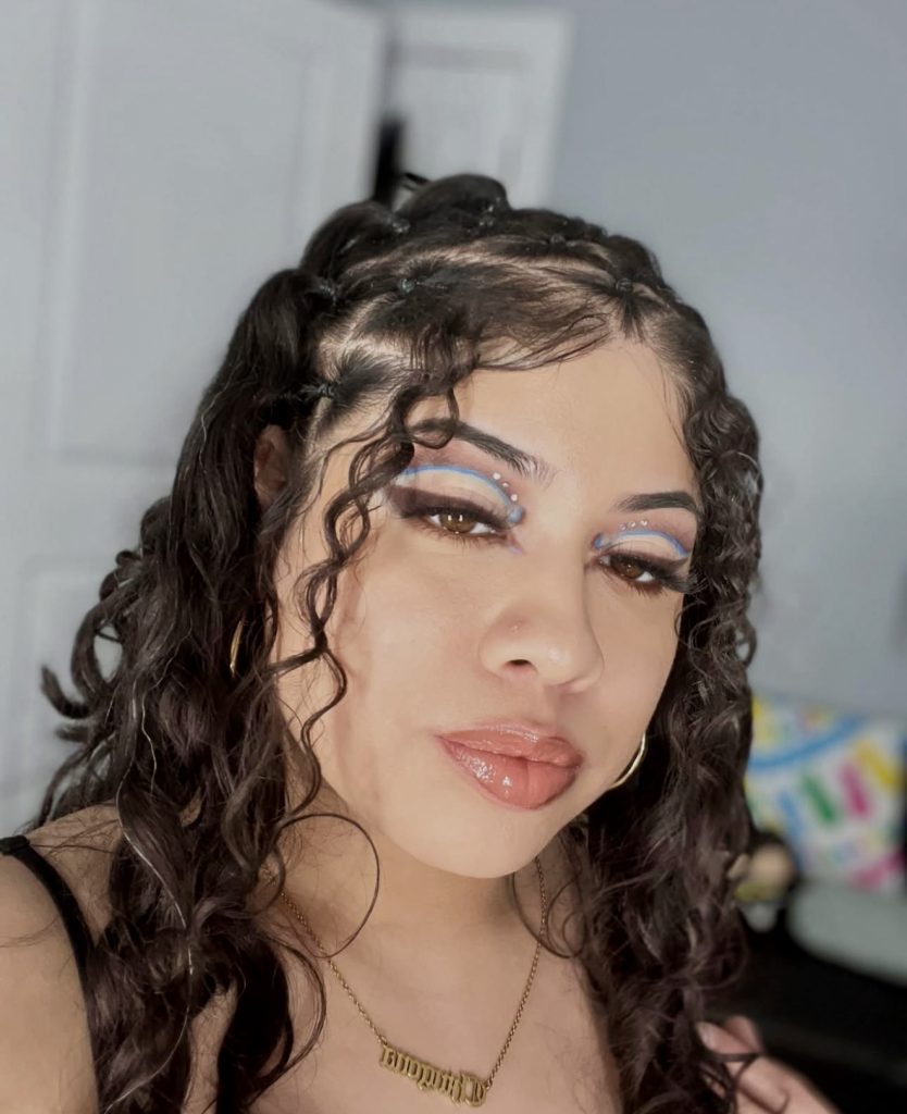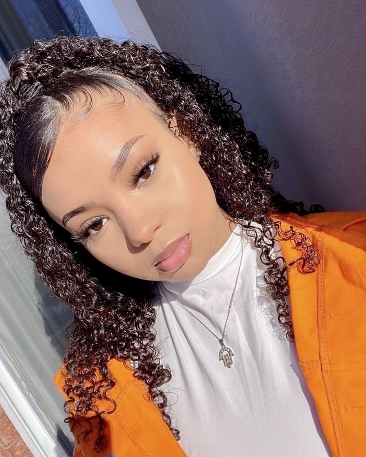 This look is dreamy, artsy, and effortlessly cool. The loose curly hair paired with delicate braids woven across the crown gives that “I woke up like this — but better” vibe. It is half soft glam and half of the girl with Y2K attitude, when matched with heavy eye makeup and shiny lips.