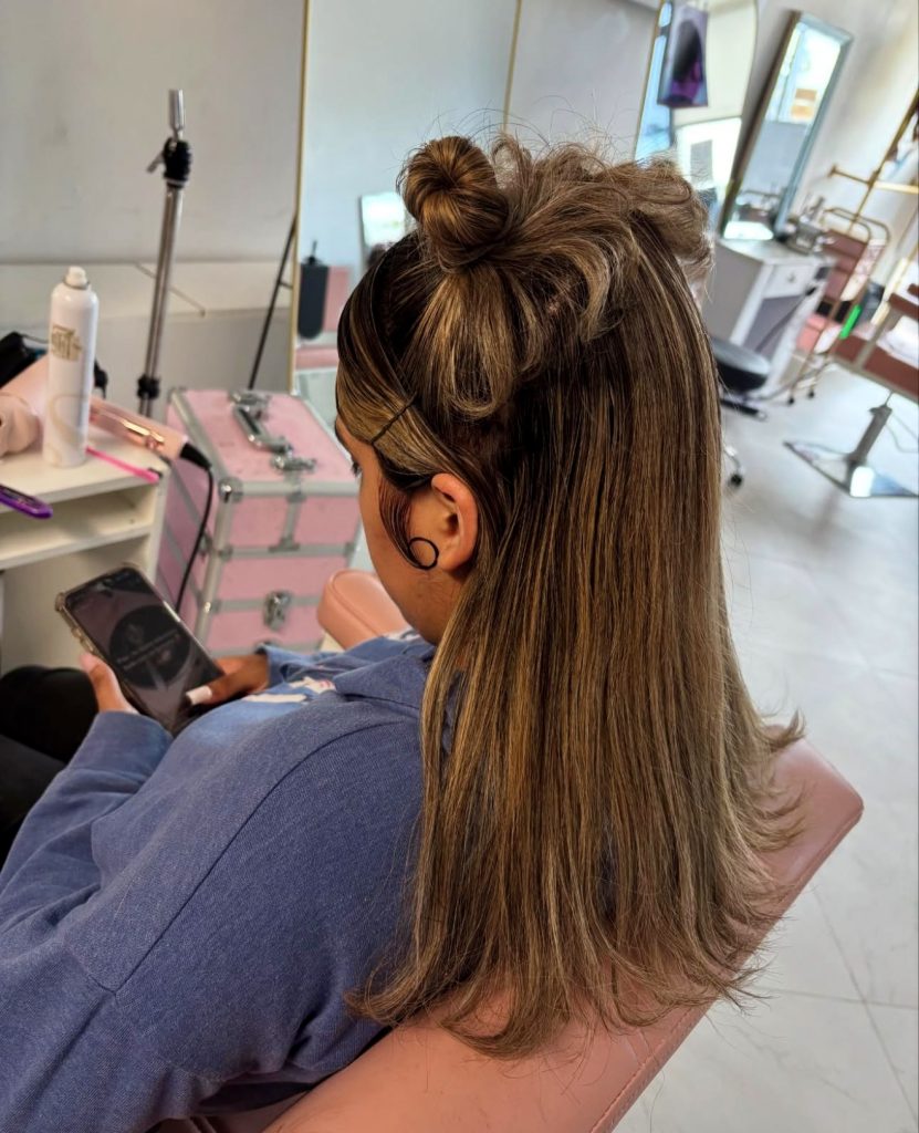 It is a vibe- space buns, side swoop, glossy curls and a chunky clip? Iconic. It’s playful, unexpected, and totally Pinterest-board-worthy. Whether you’re hitting brunch or just feel like having fun, this style makes it easy to express your mood.