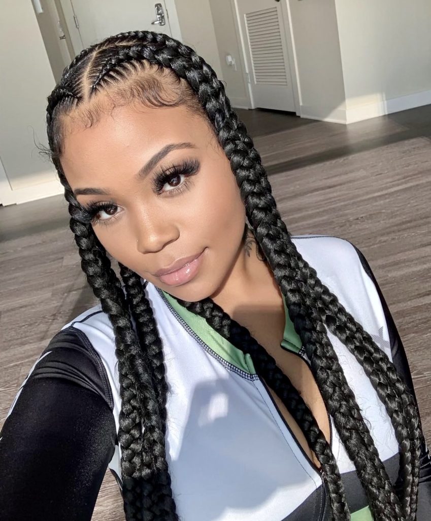 Jumbo box braids have nothing on clean geometry, except perhaps the sharp parts, thick plaits and that curb appeal of SUPER satisfaction. It is an ageless look that will never go out of fashion particularly with sharp latina edges and a glamorous makeup appearance. Effortless yet commanding.