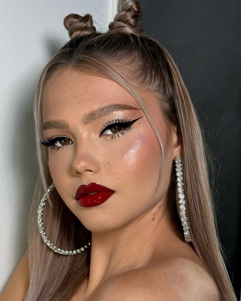 This look, which features a dramatic winged liner and strong, dark lips, is the perfect choice if you want to be noticed. The eyeliner is thick and oversteps the outer corner, which gives a bold and a very fierce look. The dark lips along with it bring some kind of mysterious and enticing charm to the look thus making it the perfect choice for night parties or special events. This look is great for the girls who are into a goth inspired aesthetic and want to flaunt it.