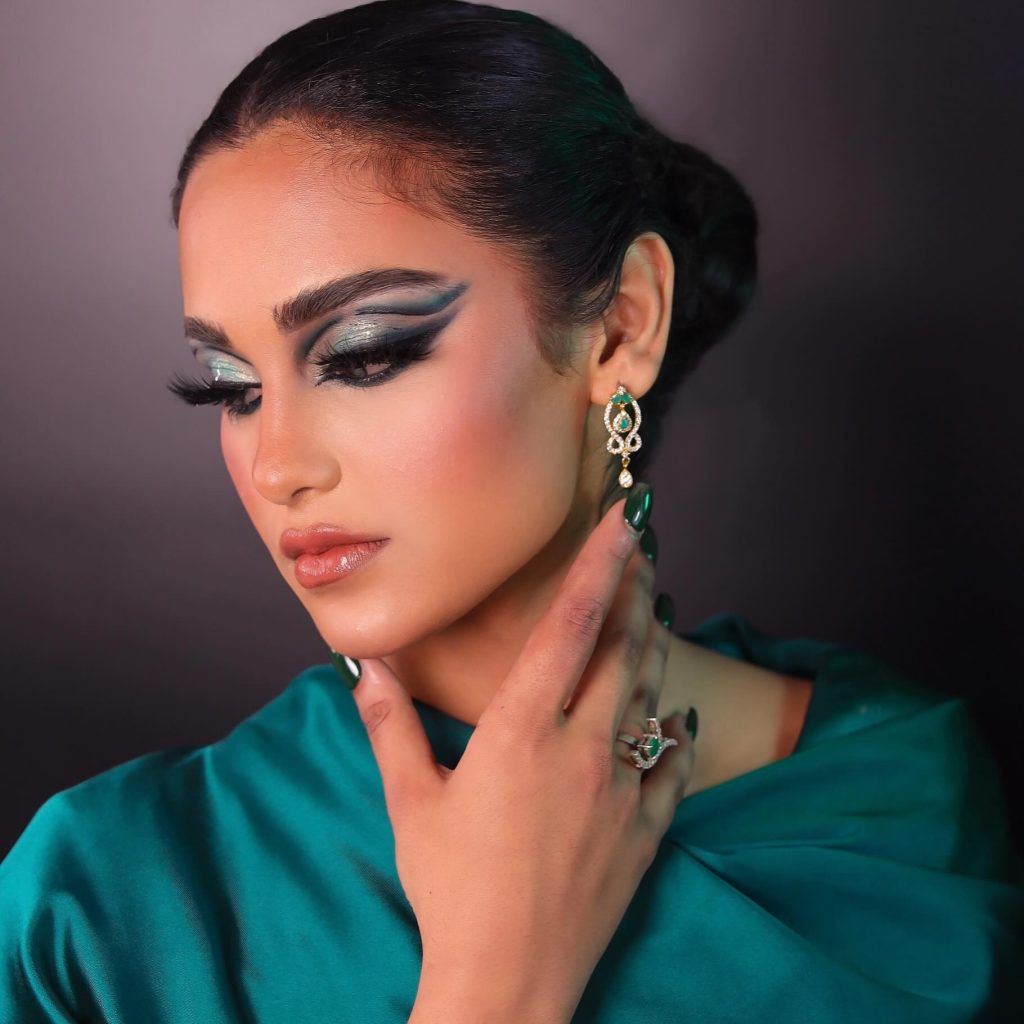 Wearing green and black is an awesome combination in this look, which consists of a black winged eyeliner and a pinch of green eyeshadow. The eyeliner is bold and the wing is extremely long, which goes well with the green shadow that brings in the shadow’s depth and brightness. This is a great style for anyone who wishes to add a surprising element to them while keeping the style neat and elegant. Absolutely it is suitable for the night events or party occasions.