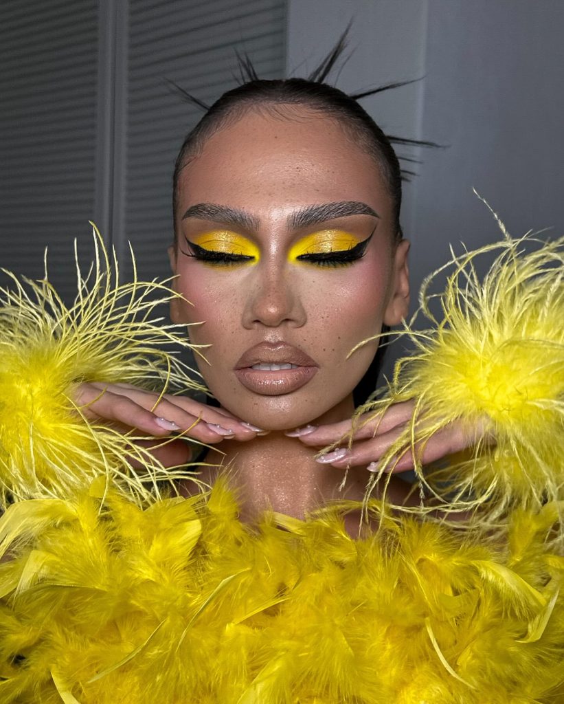 A vibrant yellow eyeshadow with a slice of winged liner is what this look is about. The sharp winged liner adds definition and structure to the look, which is the remarkable contrast with the bright eyeshadow. This is suitable for those who define the chaotic and free-spirited personality as lively and energetic. The attention-grabbing yellow color definitely brings the entertaining aspect to it, so it is perfect for whoever likes to mix colors.