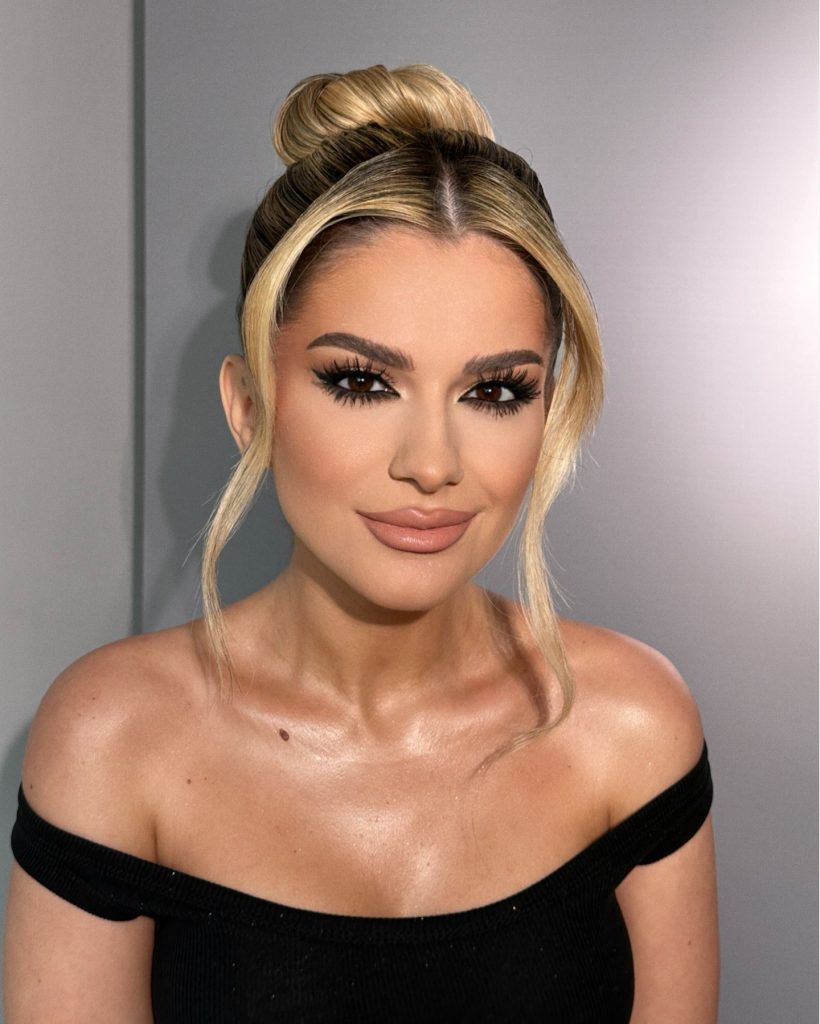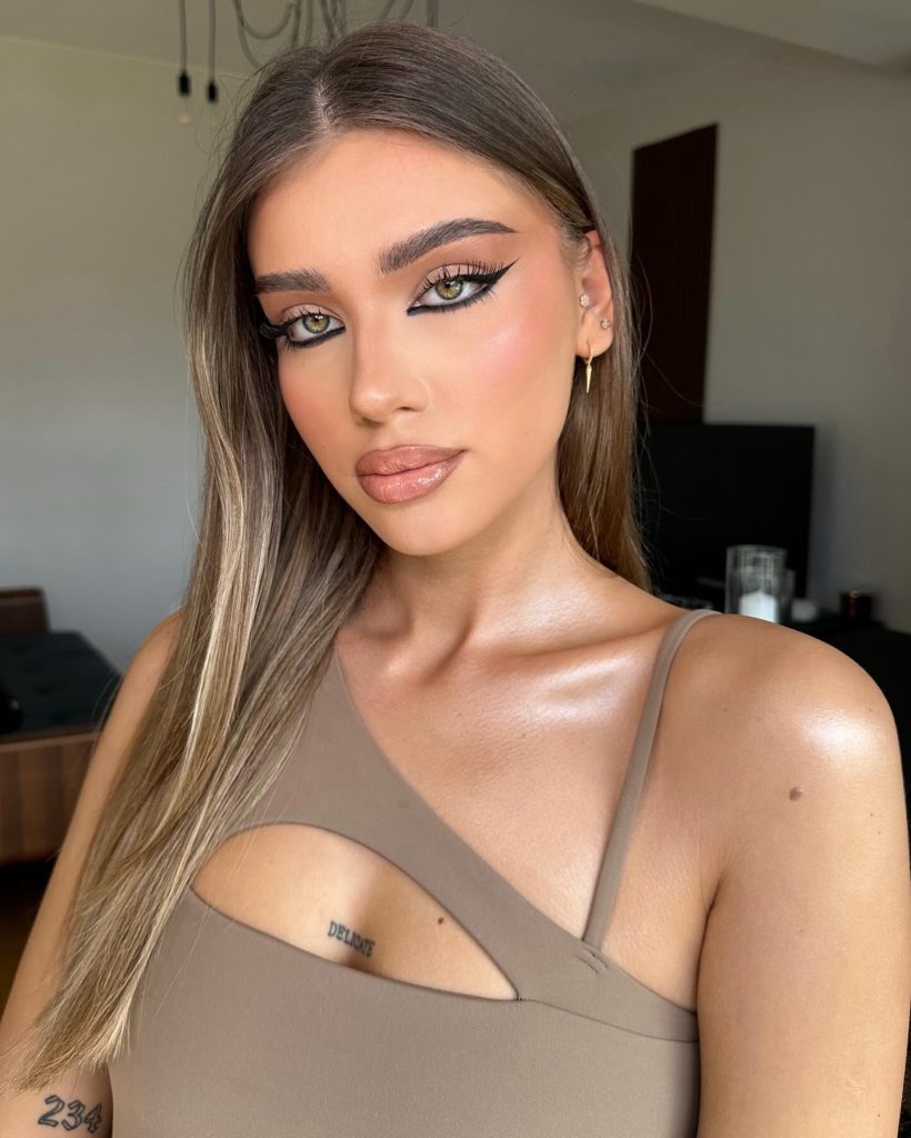 With a sharp style of winged liner and nude lips, this look is all about clean and easy the makeup artist goes. “Mind you, the eyeliner is used in an absolutely straightforward and very precise way, it results in effects of cleanness and elegance. “The masterly simplicity of the style is suitable for a day as well as for a night update, thus, it is a useful part of your make-up routine. The usage of only little face make-up would be obligatory thus focusing entirely on your eyes.”