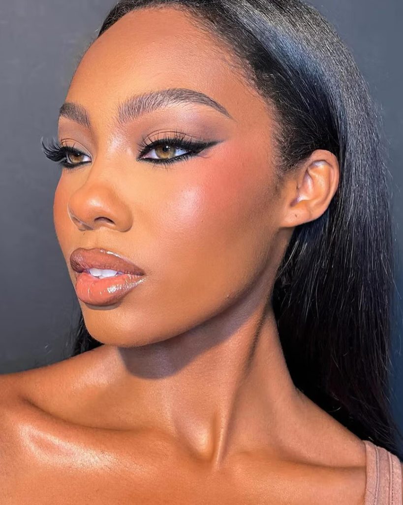 This is wet makeup look combined with sharp winged liner is the look that this highlight is about. The eyeliner is color and shape-dominant, making it look totally different from the dewy skin. This style is totally for you if you want to experiment with a fresh and modern style. It can be worn with neutral lips and a little face makeup to draw attention to the eyes and the dewy skin effect.