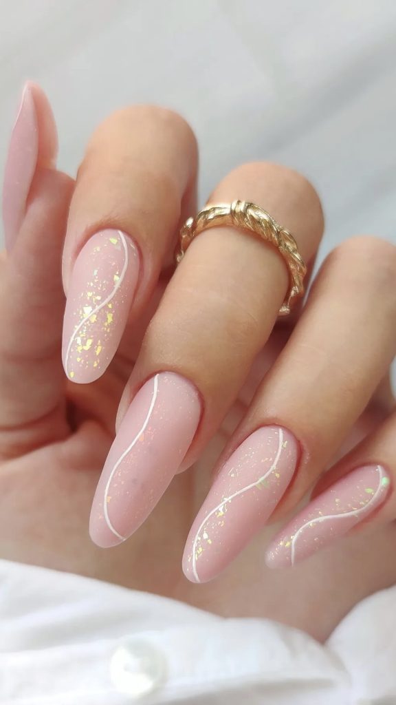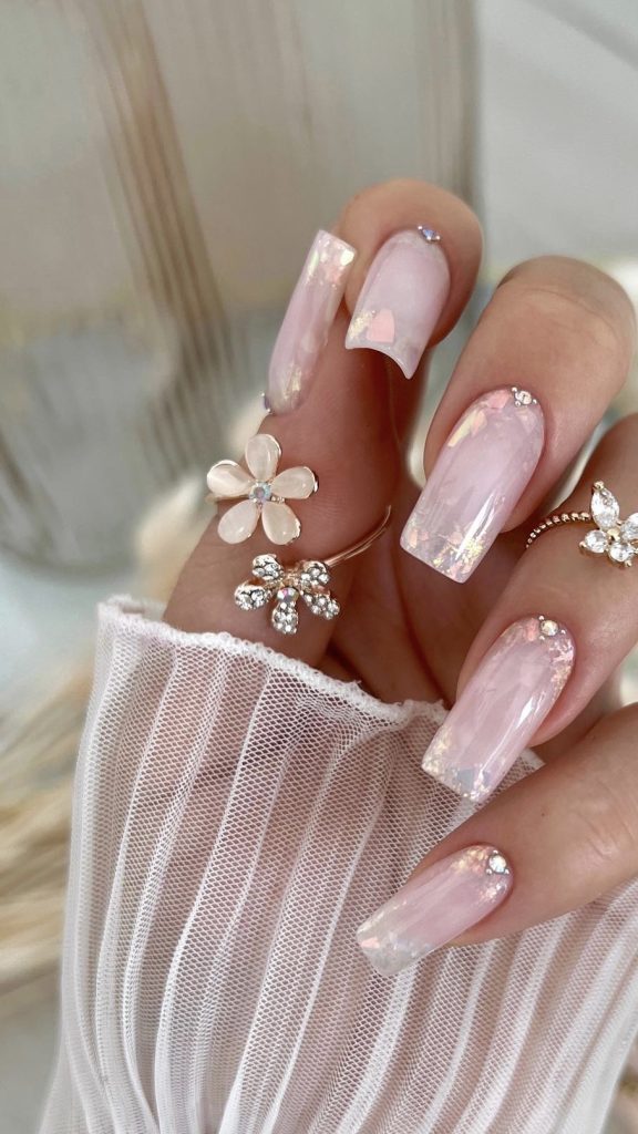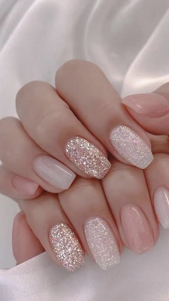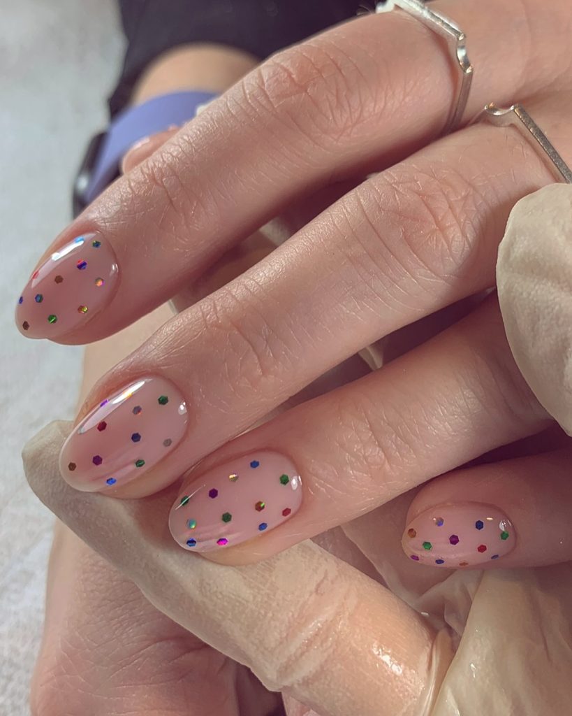 Speckles of glitter grace a pink base, creating a look that’s both sophisticated and playful. It’s reminiscent of a sprinkle of flower petals across a garden path, a pretty pastel design that’s perfect for a springtime garden party.