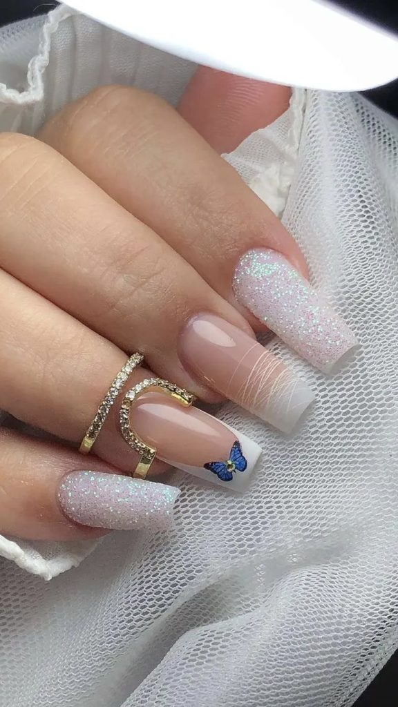 Flutter into the season with a design inspired by the gentle flutters of a butterfly. A single blue sparkle butterfly adorns a field of glitter short nails, creating a narrative of spring’s awakening. This nail art tells a story of transformation, ideal for those who appreciate nature’s own artistry.