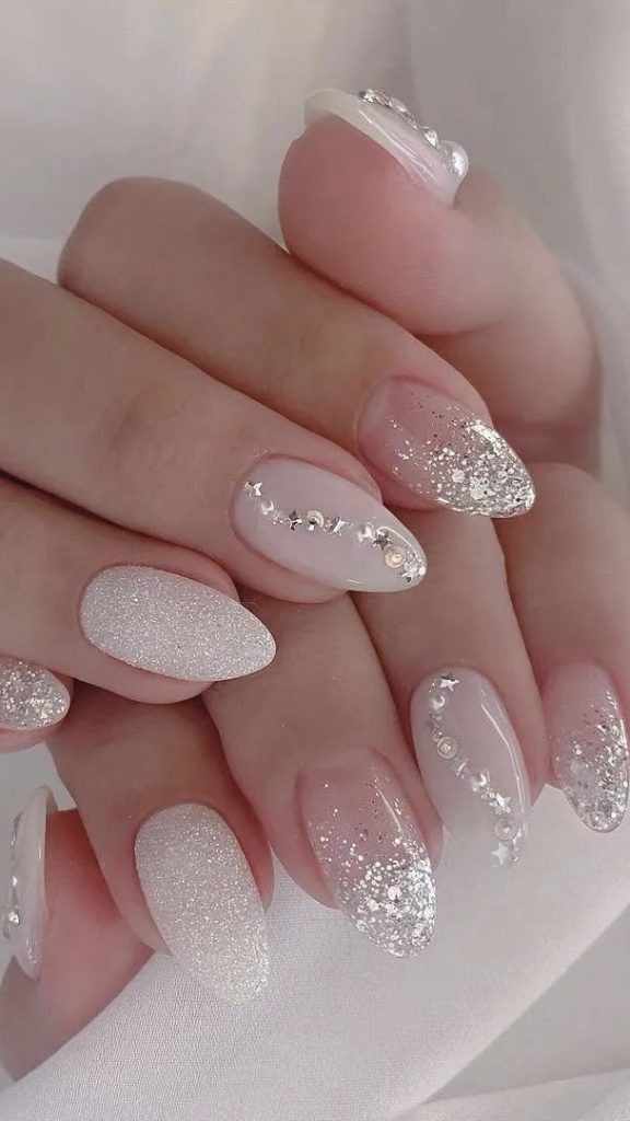 Dive into the cool tones of spring with a design with silver glitter, deep and inviting. The nails are covered in waves of glitter that catch the light like sunlight on water. This design is perfect for fashionable, perfection-seeking individuals.