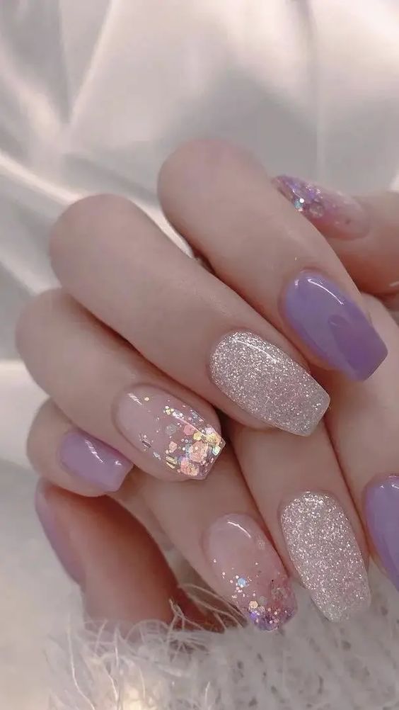 Elegance is redefined with these lilac and white nails, featuring delicate lines and a dusting of glitter. It’s a modern take on the classic French tip, infused with a light pink sparkle that’s quintessential for a chic spring day.