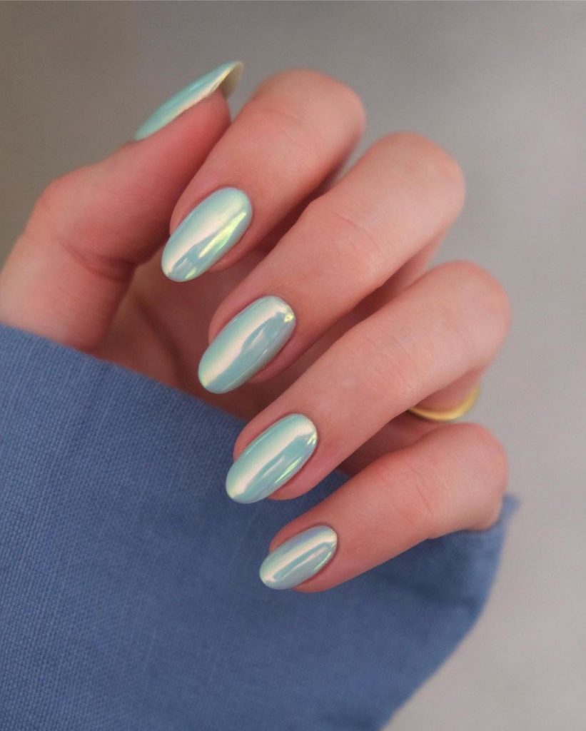 Enter a dreamlike state with the iridescent shimmer of these nails, reflecting the many hues of a tranquil spring sky. The blue sparkle is not just a color but an experience, reminiscent of the clear, expansive skies of April, perfect for a day out in the gentle warmth of the sun.