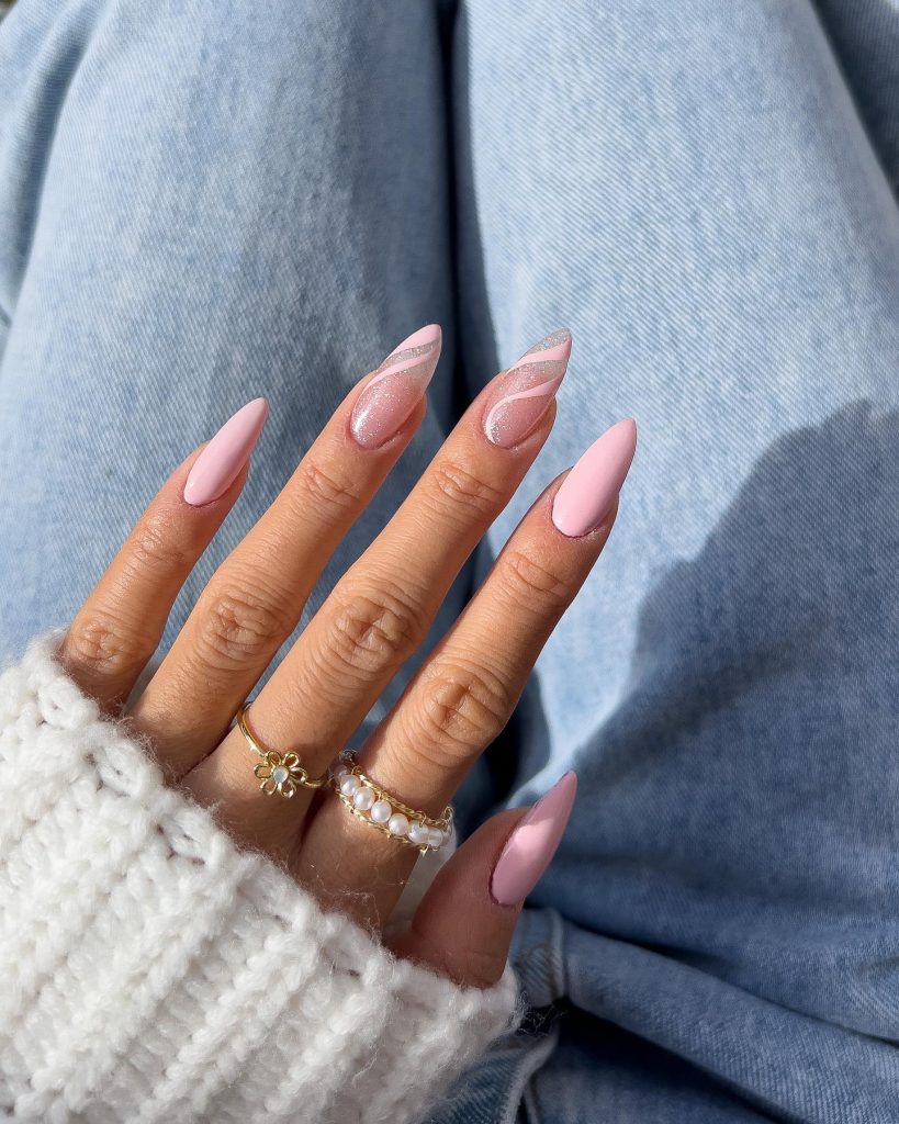 Sometimes, simplicity speaks volumes. A classic pink base with a touch of glitter near the cuticle area brings a timeless elegance that’s always in style. It’s the ideal choice for the woman who values a refined aesthetic that’s both modern and understated.