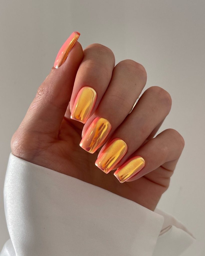 For those who love a pop of color, these nails are a vibrant statement. With a juicy glitter red and orange, they bring to mind the fresh, zesty flavors of spring’s favorite fruits, perfect for complementing a bold and bright outfit.