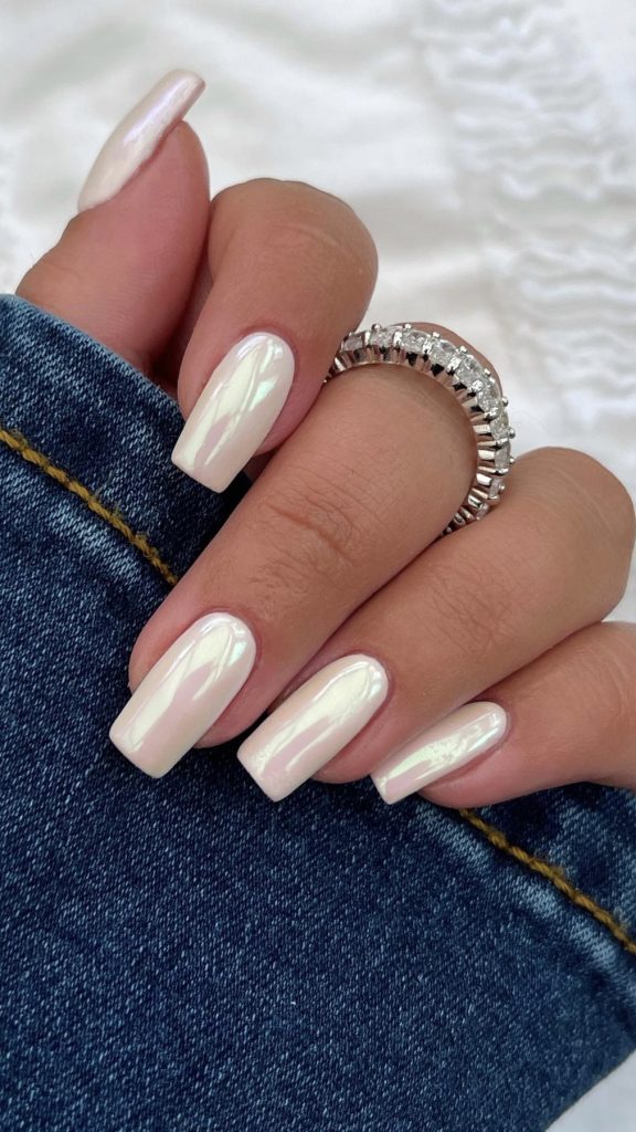 A creamy base with a milky light pink sparkle creates a look that’s both dreamy and grounded. These nails are ideal for those who love their glitter to come with a side of cosmic wonder, evoking the vastness of the night sky sprinkled with stars.
