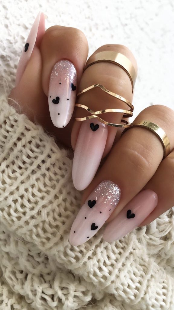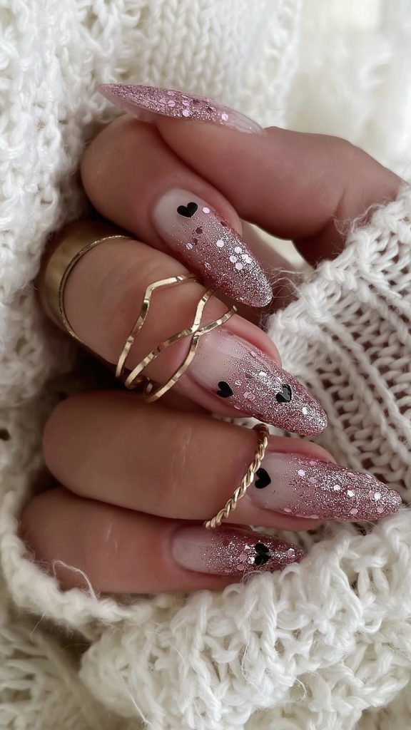 Adorned with tiny black hearts, these nails are a sweet symphony of love and style. The pink sparkle base is the perfect canvas for expressing one’s affection, making it a delightful choice for a springtime date or a casual brunch with loved ones.