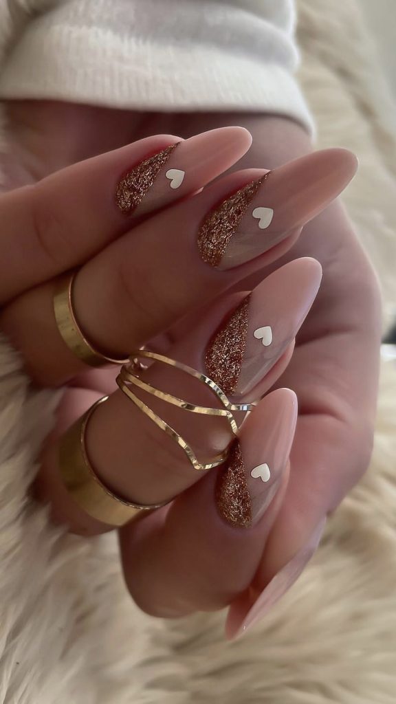 Here, romance meets luxury with a soft pink base adorned with golden glitter and white hearts, creating a design that’s rich in affection and style. It’s a sophisticated choice for those who embrace glitter short nails with a passion for detail.