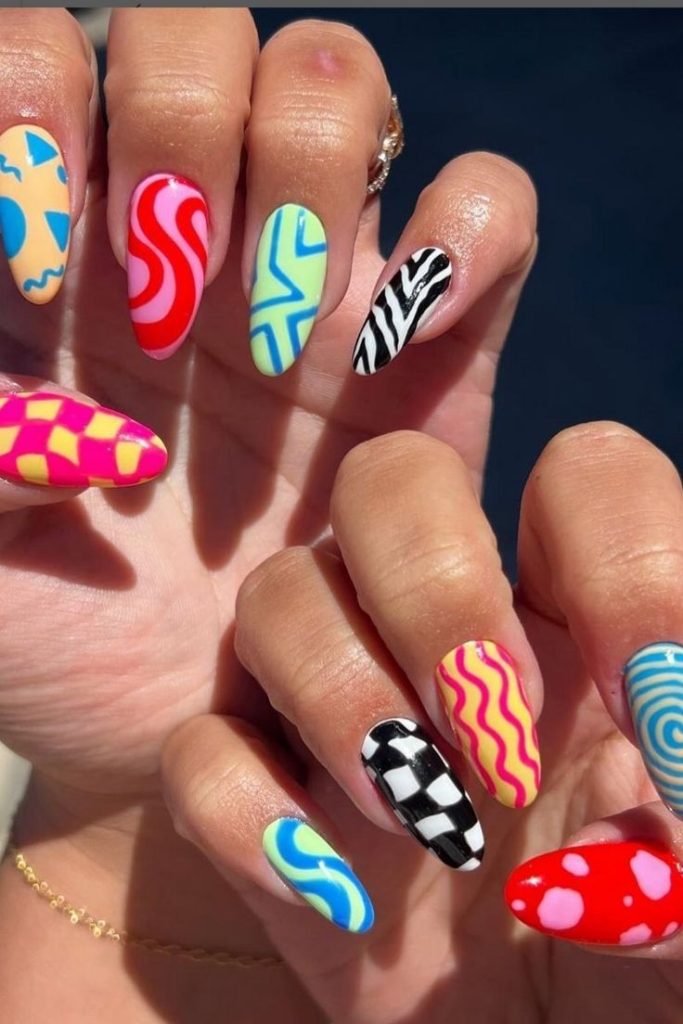 The nails that are inspired by retro fashion are making a strong comeback. They are characterized by the combination of bold abstract patterns with bright colors. These nails show a variety of designs, such as swirling, checkerboards, and typical primary colors like red, yellow, and blue. The patterns’ asymmetry not only creates but also gives a look of carefree yet stylishness. This is a look for women who want to add funky summer nails that are full of fun and creativity. Summer colors are the most colorful inspiration; you can wear this design with a flowy summer dress and bright accessories.