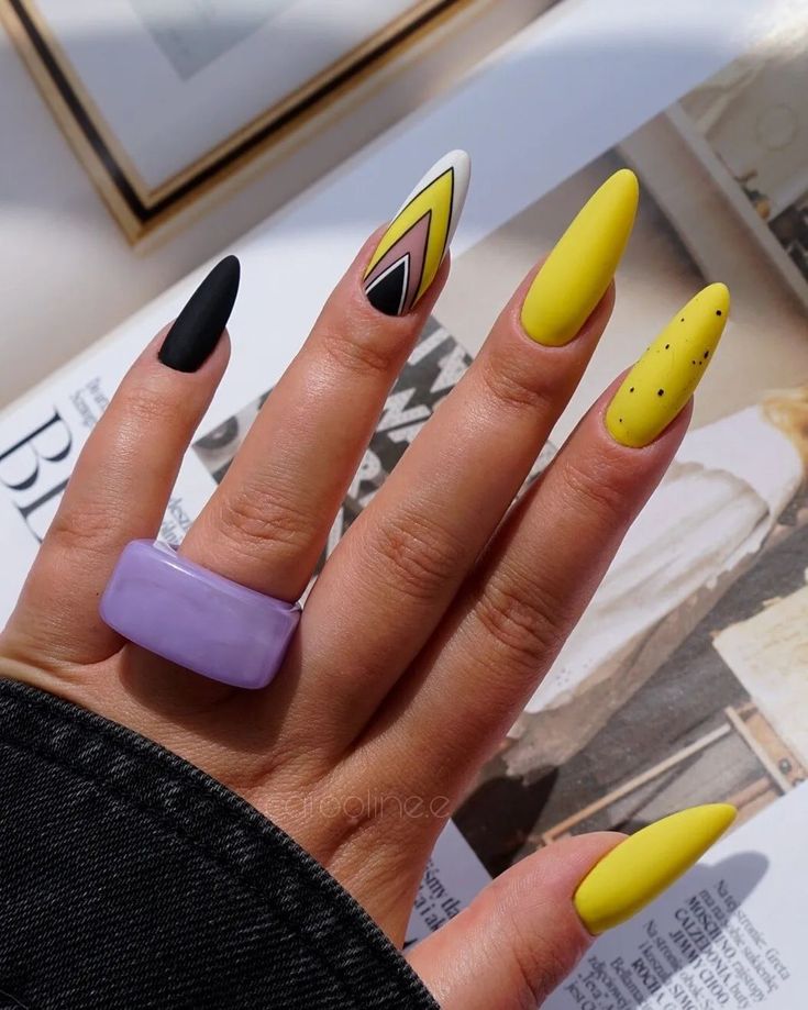 If you want a modern and edgy feel, you should think about geometric patterns mixed with bright colors. This combination displays the appearance of a sharp yellow triangle juxtaposed with a dot-black triangle while providing a clean look, and it feels bright and uncomplicated. This design fits perfectly with almond or square-shaped nails and is a good choice not only for casual outings but also for formal events. Do these nails in monochrome style for a better look.