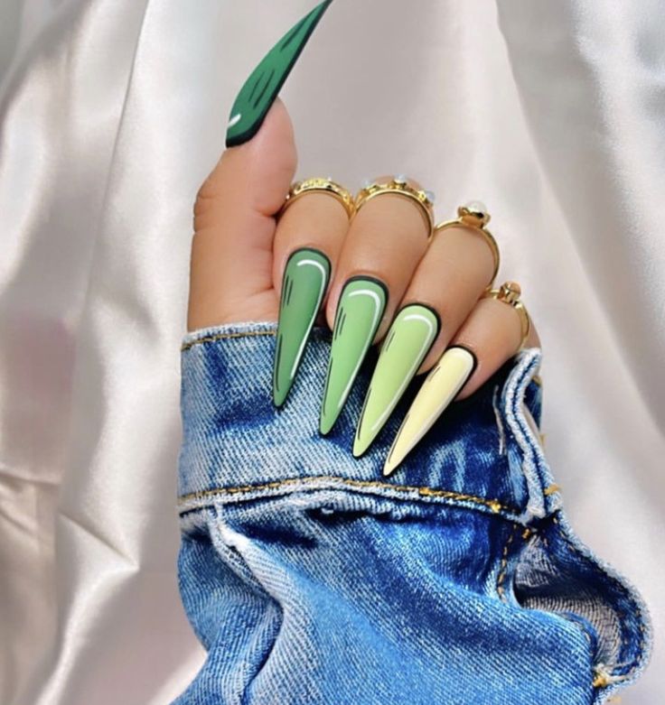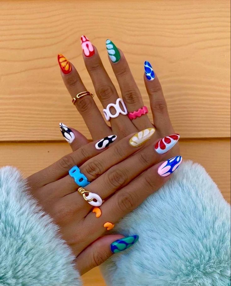 A design that is daring and artistic, this pattern contains teardrop-like gradients in different shades of green and has an outline of black to give it a 3D effect. The elongated almond shape is the one that suits the best this idea funky almond nails, and thus, it enhances the striking color contrasts, creating an edgy yet stylish look. These nails are perfect for women with their colorful and simple acrylic nail designs art ideas to make a great statement.