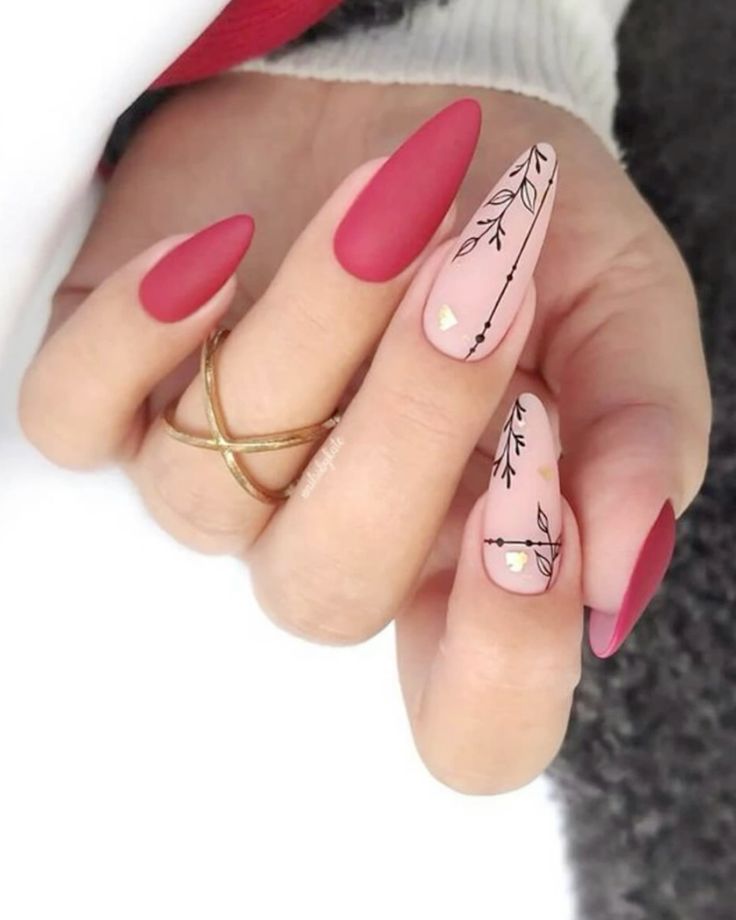 A matte red design, which is really designed with sophistication and decorated with artistic black floral patterns on a soft pink background is the perfect choice for a minimalist yet trendy style. The simplicity of this style makes it suitable for both a social event and a casual outing. However, the almond-shaped nails, a classical feature to them, turn this into one of the funky almond nails ideas. To make this look more attractive, you can wear it with gold jewelry.