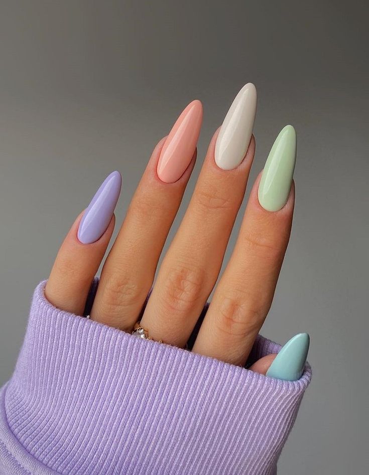 A good match for the trend of lively and fresh summer is this pastel color palette that reflects colors like lavender, mint green, and peach. The gloss finish is responsible for a youthful look, while the almond shape translates it to a well-groomed style. These are the nails for women who prefer a chic and easy nail design that they can wear with lightweight, breezy outfits or comfy knits.