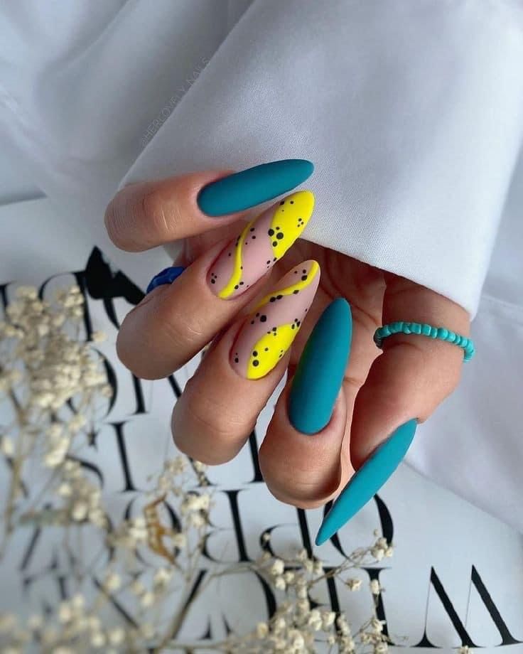 The chic turquoise lacquer on the nails paired with the wild yellow abstract patterns is an incredibly bright and imaginative design. This is the right option for this kind of mash-up with funky blue nails. The design is also flexible and can be worn both during the day and at night, therefore it can be interpreted as both brave and graceful. These nails can be matched with such clothing which is of the opposite color for a great and shocking look.