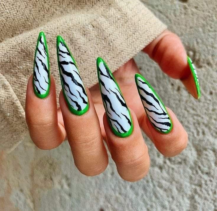 Green zebra demonic, a twist on, these distinctive, these striking, zebra-striped, nails are perfect for girls with bold and funky ideas for acrylic nail art. Darker green sides are the accents of this vibrant pop color. The pointy ends form the negative too of their sharp and edgy feeling. The “Into the Wild” look with animal prints is a fun style for daring women who like the attention. To feel the full effect it is best to wear this kind of design with neutral clothes.