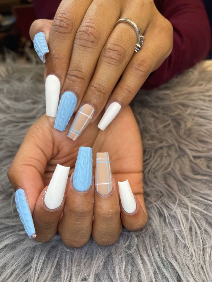 This pattern of the icy blue colors mixed prints of the sweater textures, silver glitter, and plaid patterns is a winter classic. These nails are suitable for the holiday season since they have a look of beautiful details and a warm aesthetic at the same time. The textures and colors are ideal for girls who are into funky winter nails and still want to add some shimmer.